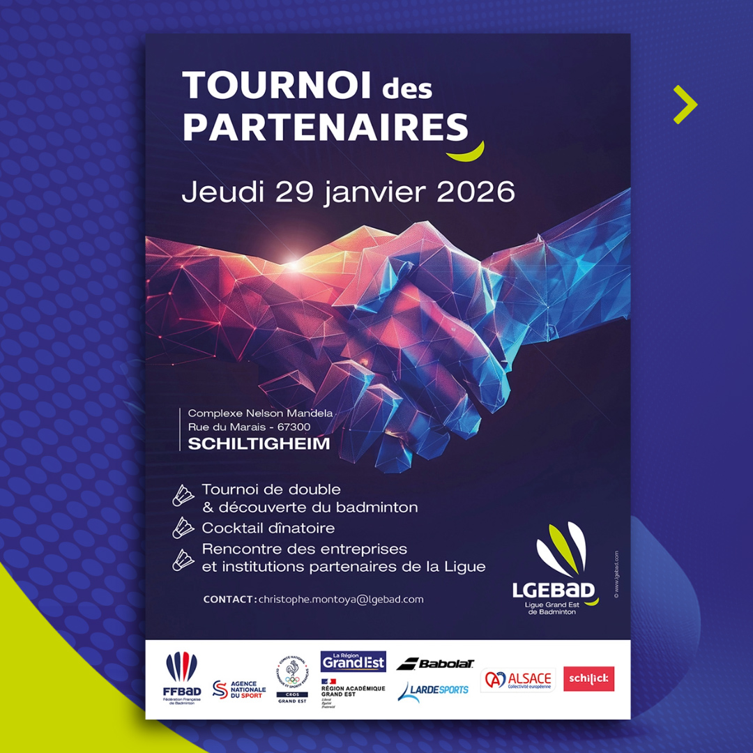 Et plus particulièrement notre Tournoi des Partenaires, dont la 2e édition aura lieu le 29 janvier 2026 à Schiltigheim : un événement convivial alliant sport, échanges professionnels et esprit d’équipe — valeurs partagées par le badminton et le monde de l’entreprise.