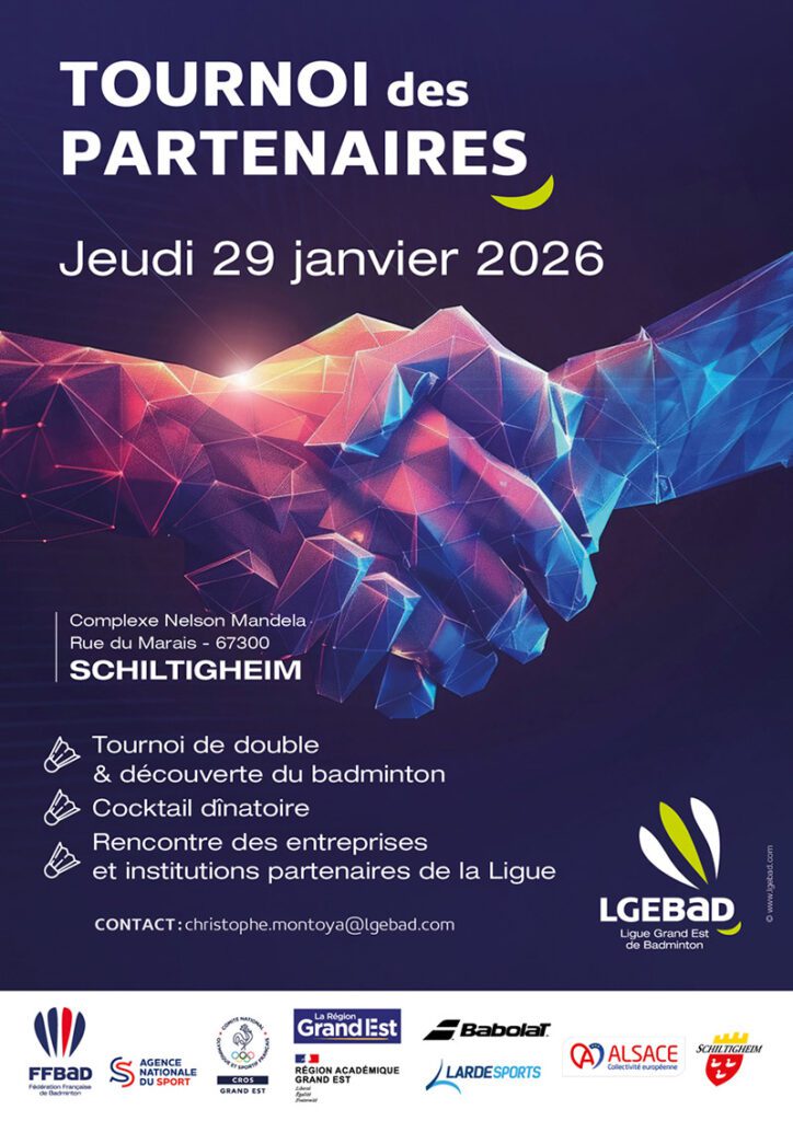 Et pour clore en beauté cette grande célébration du badminton, place à notre 2ᵉ Tournoi des Partenaires de la Ligue ! Rendez-vous le jeudi 29 janvier à Schiltigheim pour un événement qui fera rayonner le badminton et notre belle région !
