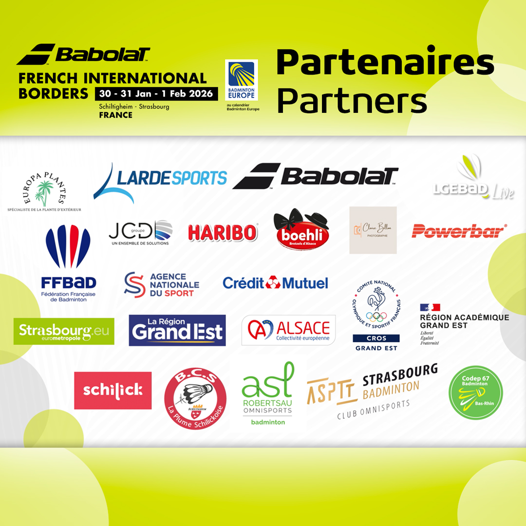 La Ligue Grand Est de Badminton adresse ses sincères remerciements aux clubs partenaires et à leurs bénévoles, à l’ensemble des officiels techniques, ainsi qu’à nos partenaires, dont l’engagement est essentiel à la réussite et au rayonnement de ce tournoi 💚💙